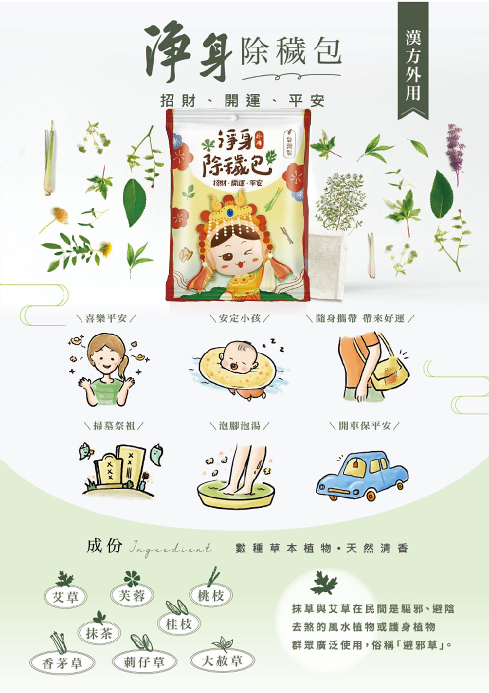 全成分:抹草、艾草、香茅草、芙蓉、桂枝、荊仔草、大赦草、桃枝等數種草本植物