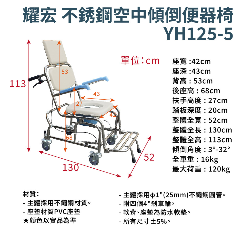耀宏不銹鋼空中傾倒便器椅YH125-5 方便洗頭 扶手可掀馬桶椅 有輪馬桶椅 不鏽鋼便盆椅 洗澡沐浴椅
