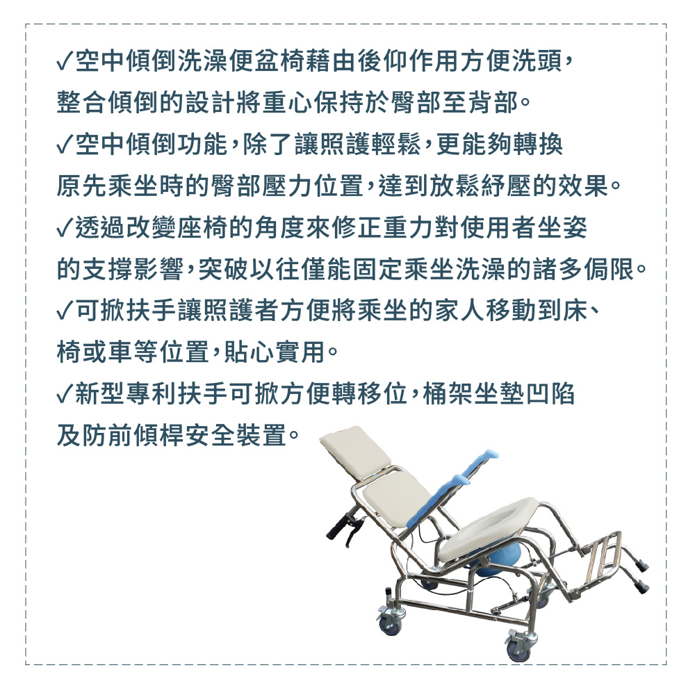 空中傾倒洗澡便盆椅藉由後仰作用方便洗頭,整合傾倒的設計將重心保持於臀部至背部。