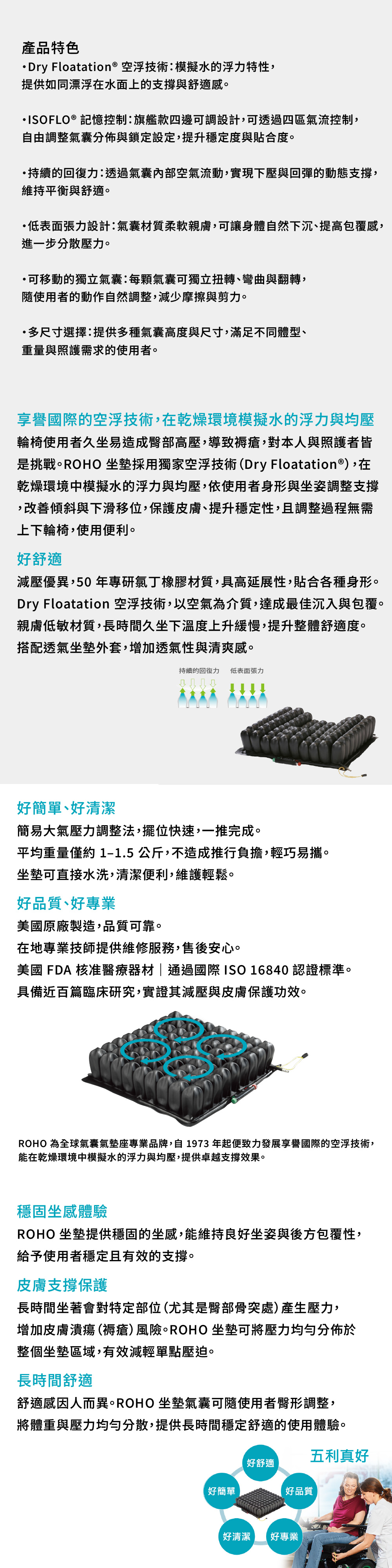 *ROHO空浮技術由ROHO公司為了在乾燥的環境模仿水的浮力與均壓,於1973年發明,為全球氣囊氣墊座專業品牌,享譽國際。