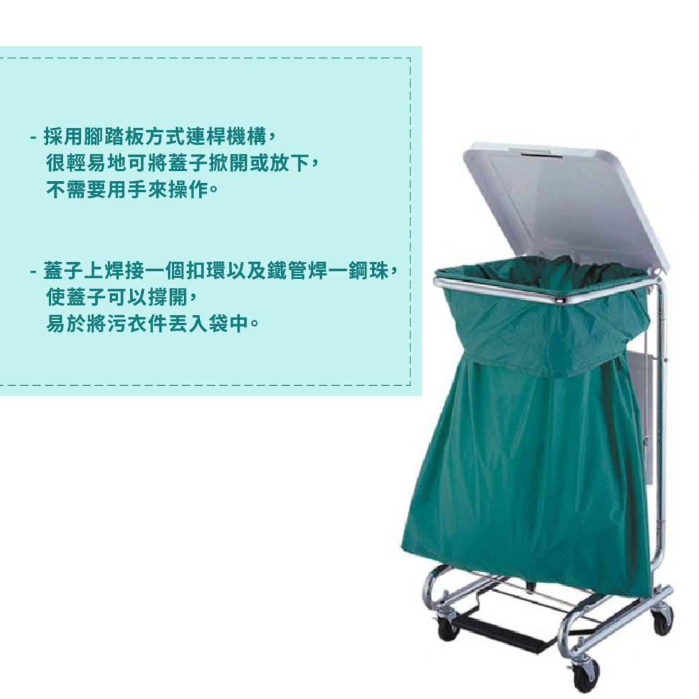 - 採用腳踏板方式連桿機構,很輕易地可將蓋子掀開或放下,不需要用手來操作。